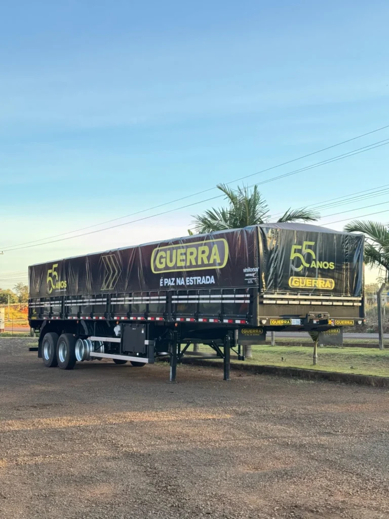 Carreta Guerra 2025, edición especial 55 años, medida 12,40 / 2026 con 1º eje elevable y vigas 80×80. Unidad nueva y lista para trabajar.